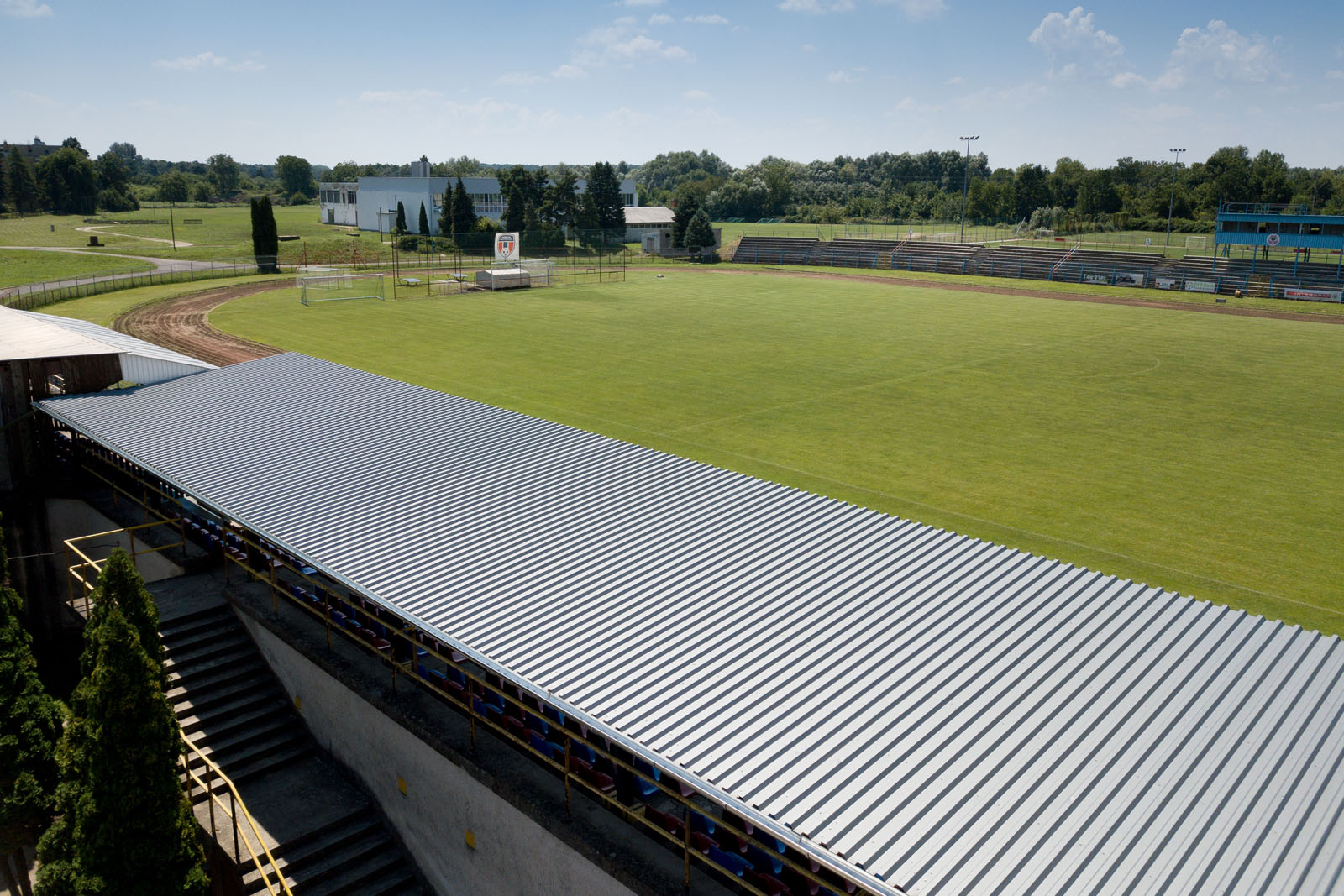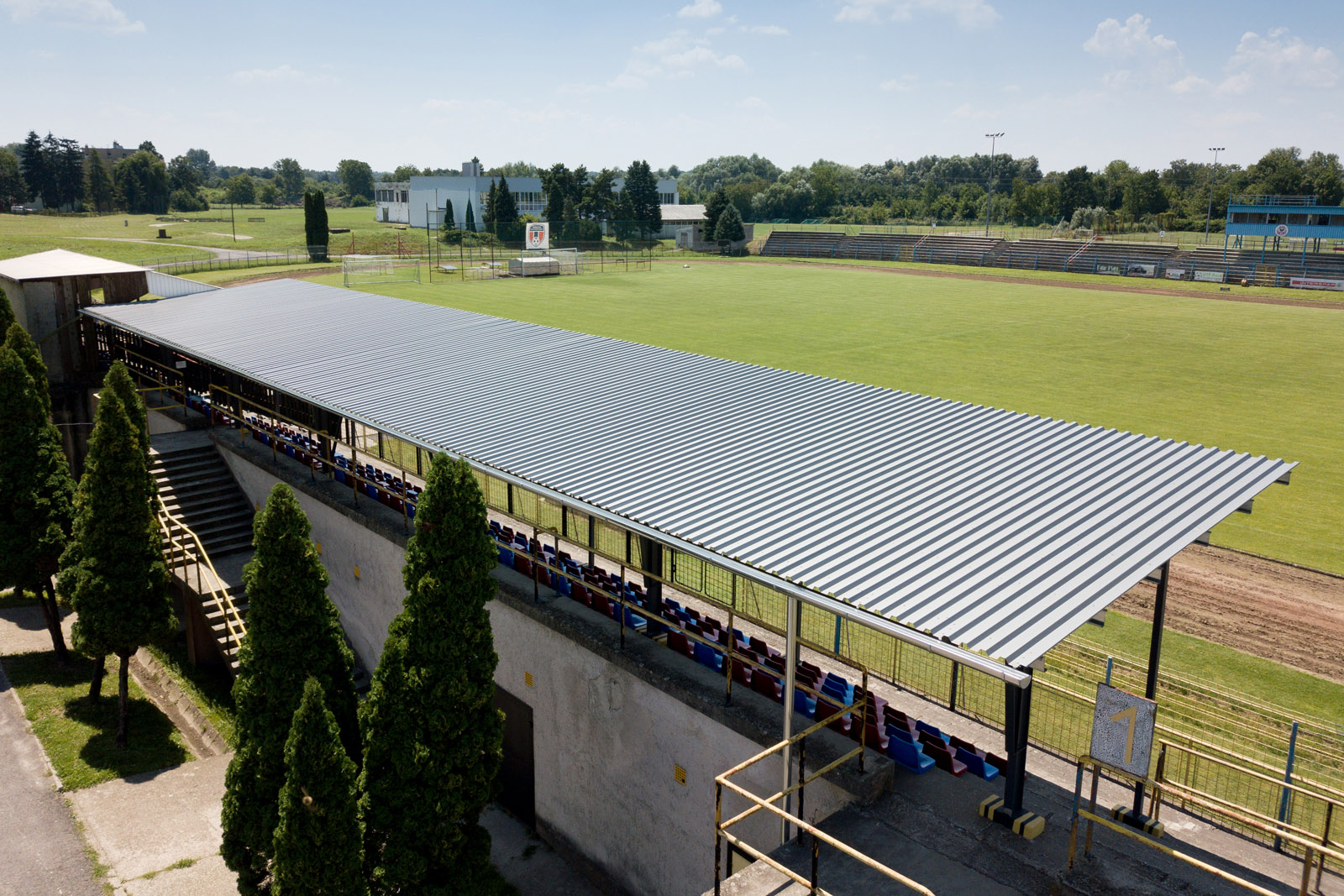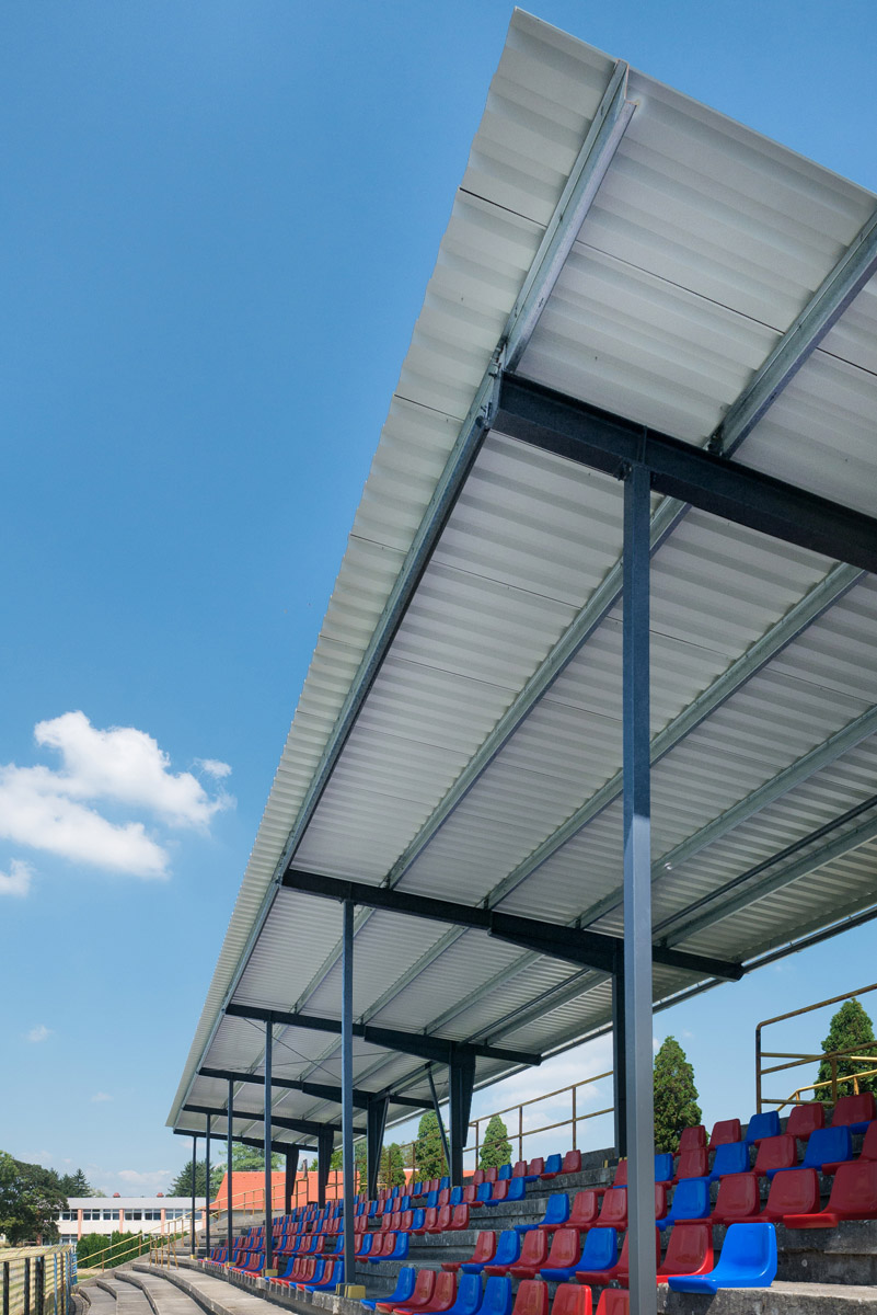 Focipálya-lelátó fedése, amely védelmet nyújt a szurkolóknak csapadék ellen és árnyékul is szolgál a tűző nappal szemben.