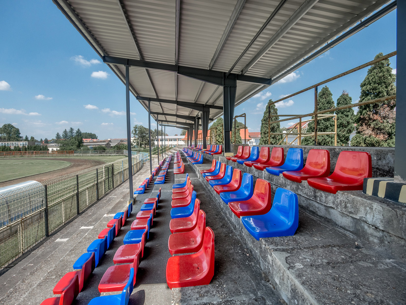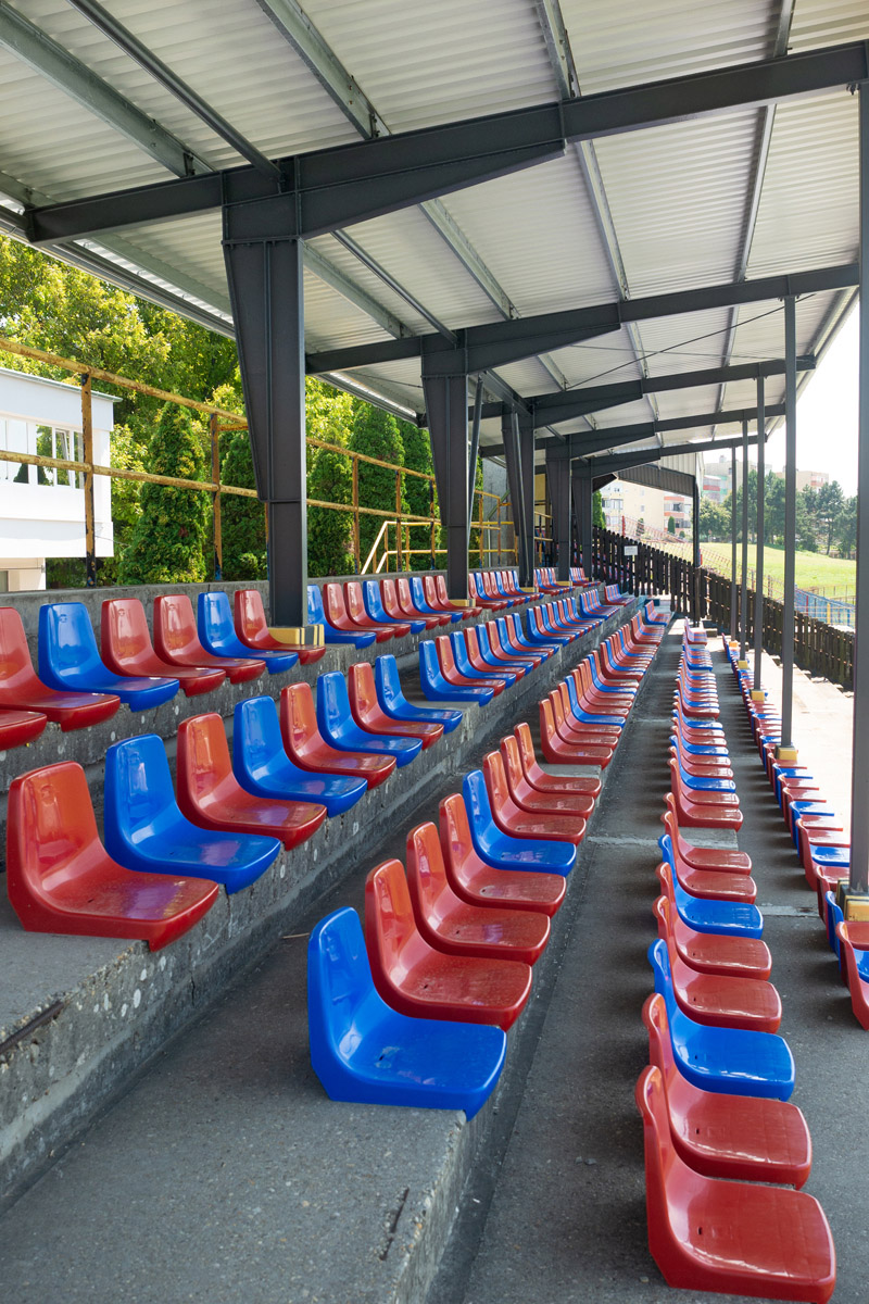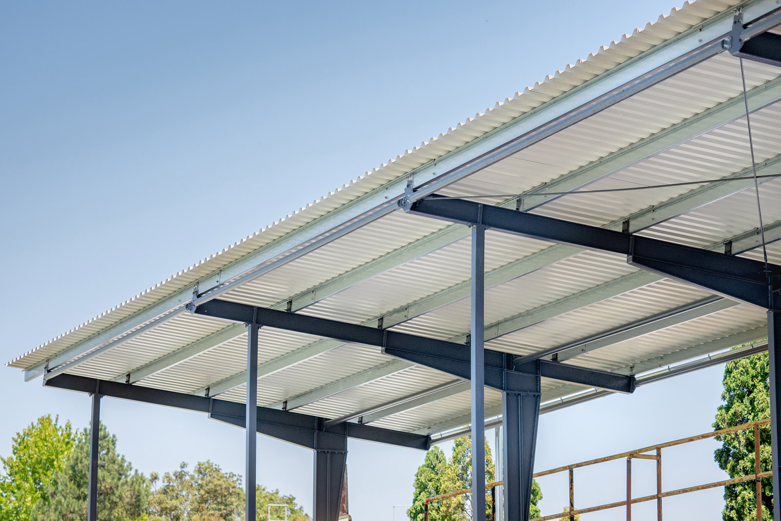 Focipálya-lelátó fedése, amely védelmet nyújt a szurkolóknak csapadék ellen és árnyékul is szolgál a tűző nappal szemben.